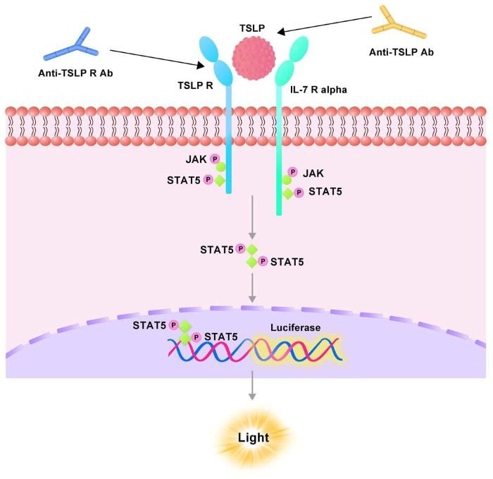 Upon stimulation with human TSLP protein, the TSLP/TSLP R interaction triggers STAT5-mediated luminescence. Inhibition of TSLP binding to TSLP R by either anti-TSLP or anti-TSLP R antibodies leads to a reduction in luminescence.