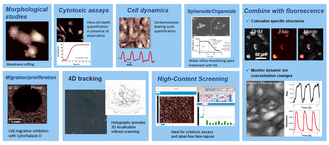 - Correlative imaging: Optional fluorescence module enables simultaneous DHM® and fluorescence acquisition to take advantage of the specificity of fluorescence for spatial or temporal correlation between the two modalities.