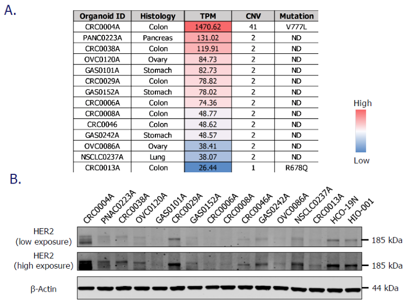 A. Analysis of transcriptional levels (transcripts per kilobase million, TPM), copy number variation (CNV), and point mutations of ERBB2 (HER2 coding gene) in PDXOs using RNAseq and WES data. The list is sorted by TPM values, from high (red) to low (blue).