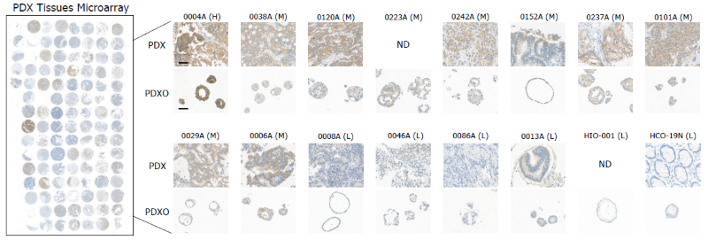 The IHC staining pattern revealed a significant level of HER2 expression between PDXOs and their associated PDX tissues. Scale bar: 50 μm. H denotes high, M indicates moderate, L indicates low, and ND indicates not detected.