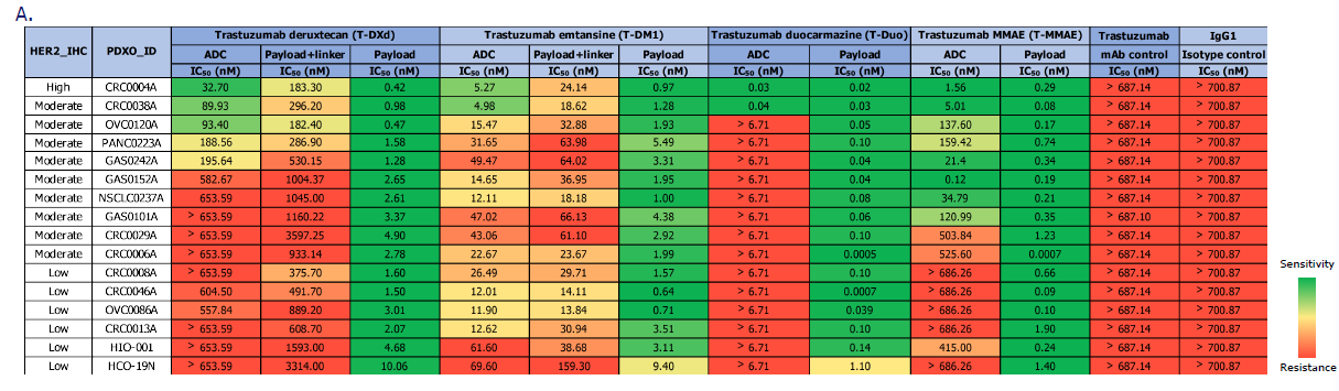 - Cell viability was assessed in 14 PDXO models with high, moderate, or low HER2 expression levels to evaluate responses to four HER2-targeted ADC medicines.