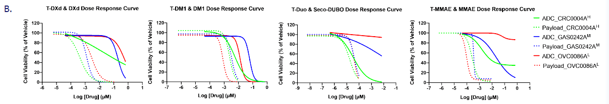B. Cell viability curves for CRC0004A (HER2High, green lines), GAS0242A (HER2moderate, blue lines), and OVC0086A (HER2low, red lines) for four ADCs (solid lines) and payloads (dashed lines).