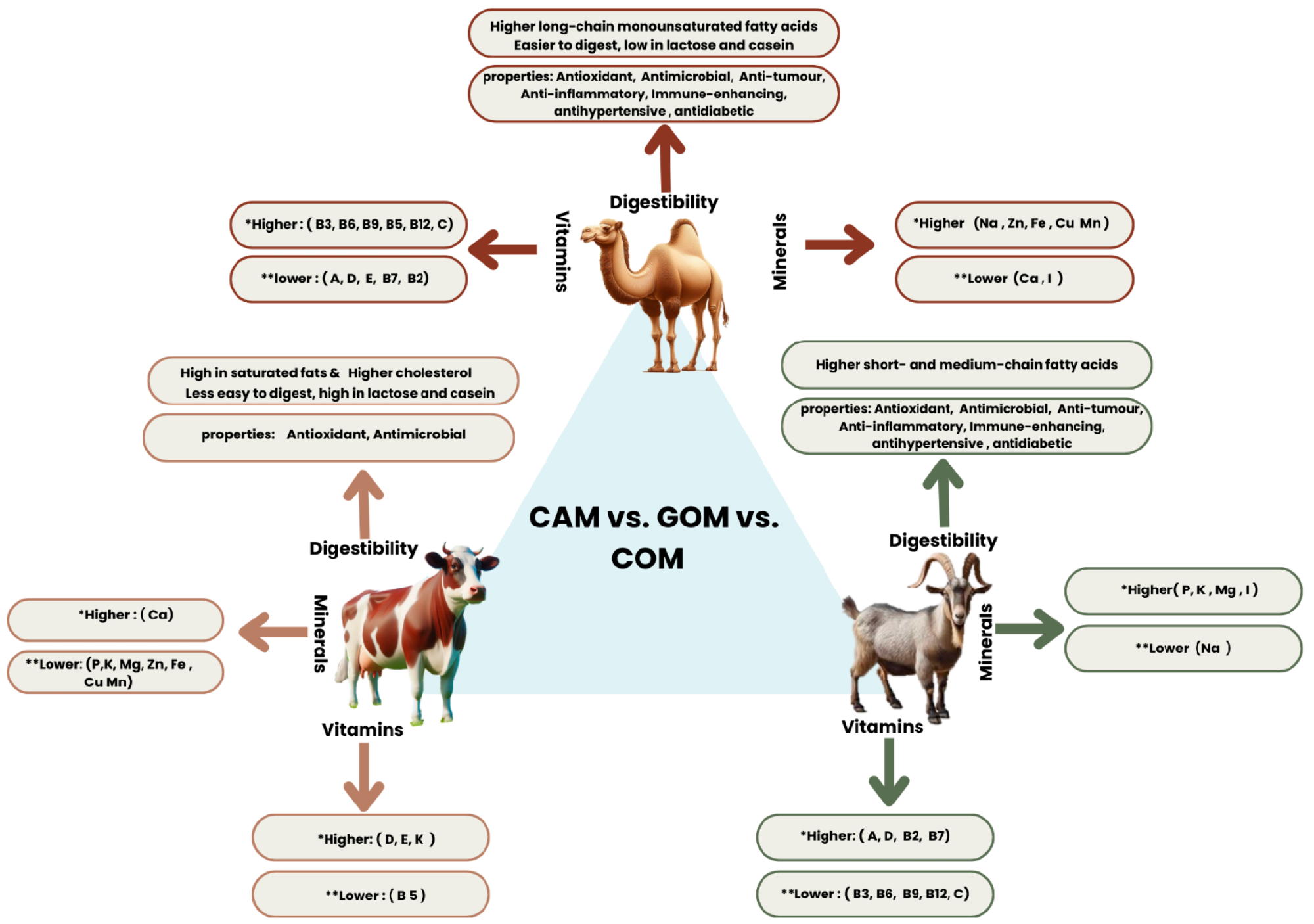 Goat milk is often considered more digestible than cow milk; however, camel milk exhibits a broader range of antimicrobial and metabolic bioactivities. Nonetheless, camel milk’s strong flavor, limited availability, and higher cost affect consumer acceptance and market expansion.5