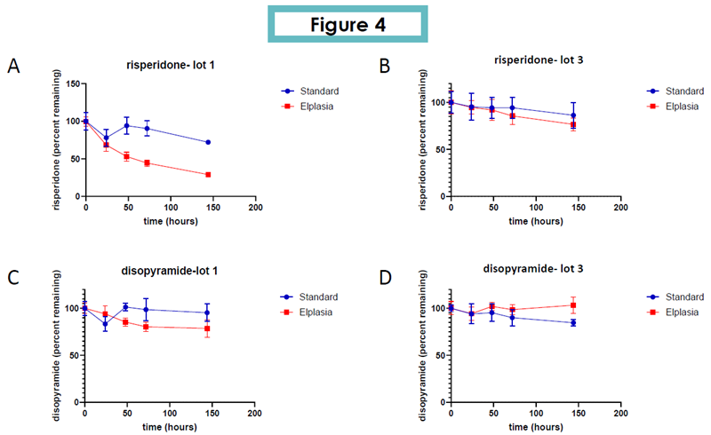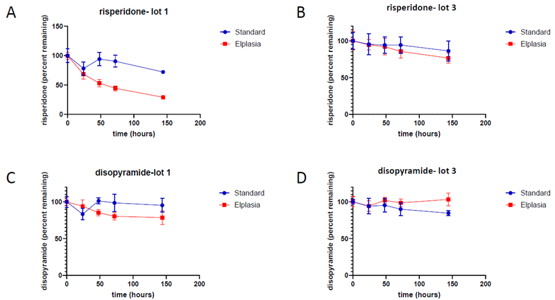(B) Risperidone was poorly digested in both plate types in lot 3 (23 % depletion in Elplasia and 13 % in standard). (C) Disopyramide was not removed efficiently in either plate type for lot 1 (Elplasia 21 % depletion, standard 4 % depletion) (D) or lot 2 (Elplasia no depletion, normal 17 % depletion).
