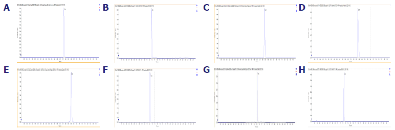 A: 4-MU. B: 4-MUS. C: 1-Naphthol. D: 1-Naphthol Sulfate. E: 17β-Estradiol. F: E2S. G: DHEA. H: DHEAS. The chromatograms of the analytes resolved by the established LC‐MS/MS methods. Image Credit: Pharmaron