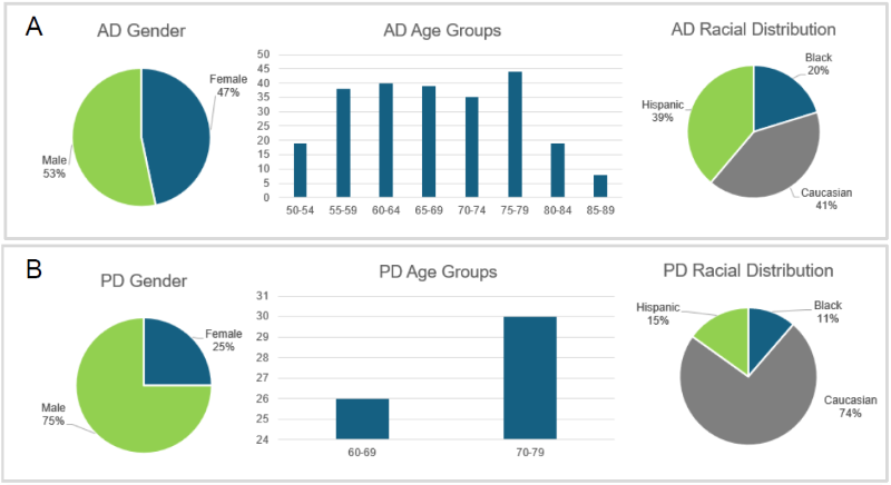 The Alzheimer's (A) and Parkinson's (B) patient cohorts were distributed according to gender, age range, and race. Because there were few Asian patients in the cohort, racial comparison studies were limited to the three races (Black/African American, White/Caucasian, and Hispanic).