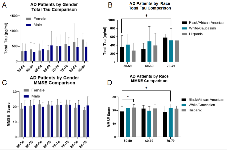 Figure 2. Comparison of Total Tau Levels and MMSE Scores by Gender and Race in Alzheimer's Patients. Image Credit: BioIVT