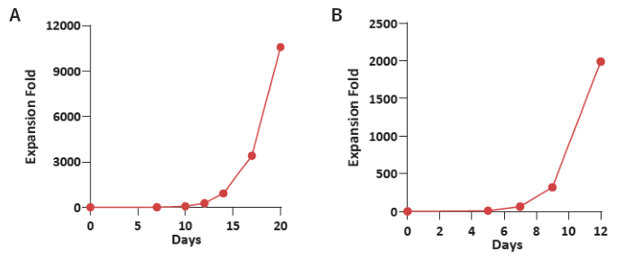 Figure 1. (A) Donor 1 and (B) Donor 2 human CBMCs were cultured using the Immune Cell Basal Medium with CelThera™ Immune Cell Supplement C. The resulting expansion fold exceeds 1,000 on Day 11 and can reach 10,000 on Day 19. Image Credit: ACROBiosystems