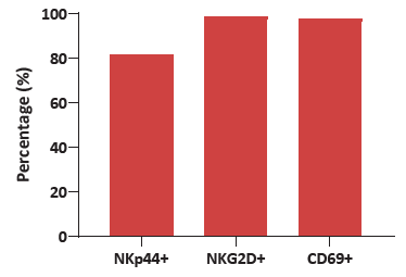 Figure 2. Human CBMCs were cultured for 2 weeks using Immune Cell Basal Medium with CelThera™ Immune Cell Supplement C. Varying ratios of NKp44/NKG2D/CD69, all markers of activation, reveal significant levels of activation after the culturing process. Image Credit: ACROBiosystems