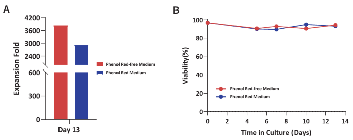 Figure 4. (A) Expansion fold and (B) viability of yδT cells were evaluated from PBMCs cultured with Basal Medium, T cell Expansion Supplement, and GMP Immune Cell Supplement D. Expansion fold exceeds 3,600 with a viability of > 90 % across the culture period. Image Credit: ACROBiosystems