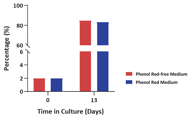 Figure 5. Cell population percentage of yδ2T after culturing using either phenol red or phenol red-free medium resulted in > 80 %. After two weeks, a high percentage of yδ2T was achieved, using the addition of several supplements alongside the traditional basal medium, revealing the capability to tailor media to a specific subpopulation. Image Credit: ACROBiosystems
