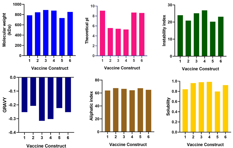 - DV5 (Designed Vaccine Construct 5; 2199 base pairs, Guanine–Cytosine content 60.48 %, Codon Adaptation Index 0.89) was codon-optimized using JCat for high-level expression in E. coli.