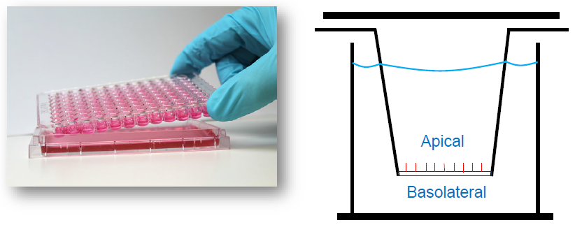 MDCK-II or MDCKMDR1 cells are seeded into Millicell-96 cell culture insert plates. Following seeding, the cells polarize and form tight junctions, resulting in a cell monolayer with apical and basal membranes. Following transfection, transporters locate to the proper membrane.