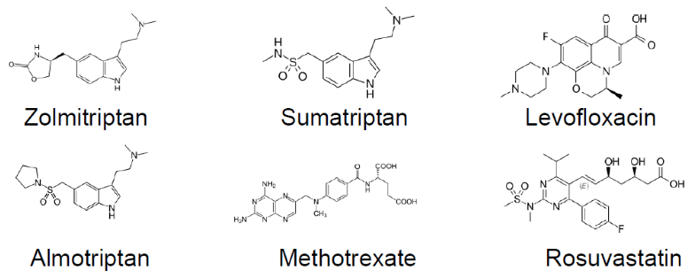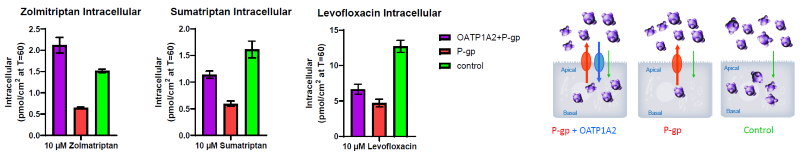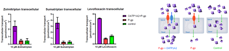 Despite being P-gp substrates, zolmitriptan, sumatriptan, almotriptan, and levofloxacin demonstrated higher transcellular transport in cells expressing OATP1A2 plus P-gp than in cells expressing P-gp alone.