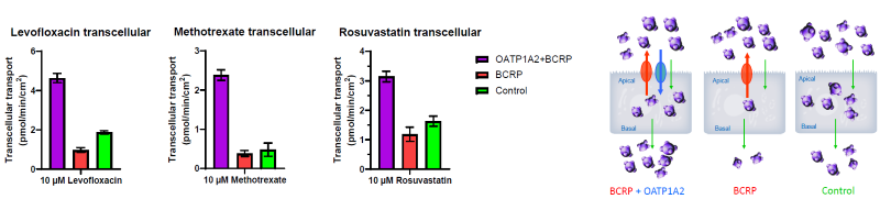 Rosuvastatin, Pravastatin, Levofloxacin, and Methotrexate all showed higher transcellular transport in cells expressing OATP1A2 and BCRP compared to cells expressing BCRP alone.