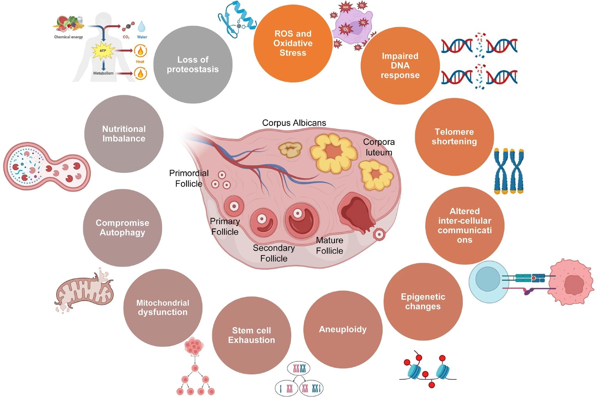 Ovarian aging is defined as the gradual and irreversible decline in both the quantity and quality of the ovarian follicle pool, a process that determines the female reproductive lifespan. Decades of research have established that, unlike somatic organs that may maintain function into late adulthood, the ovary follows an accelerated trajectory of senescence that culminates in menopause.1