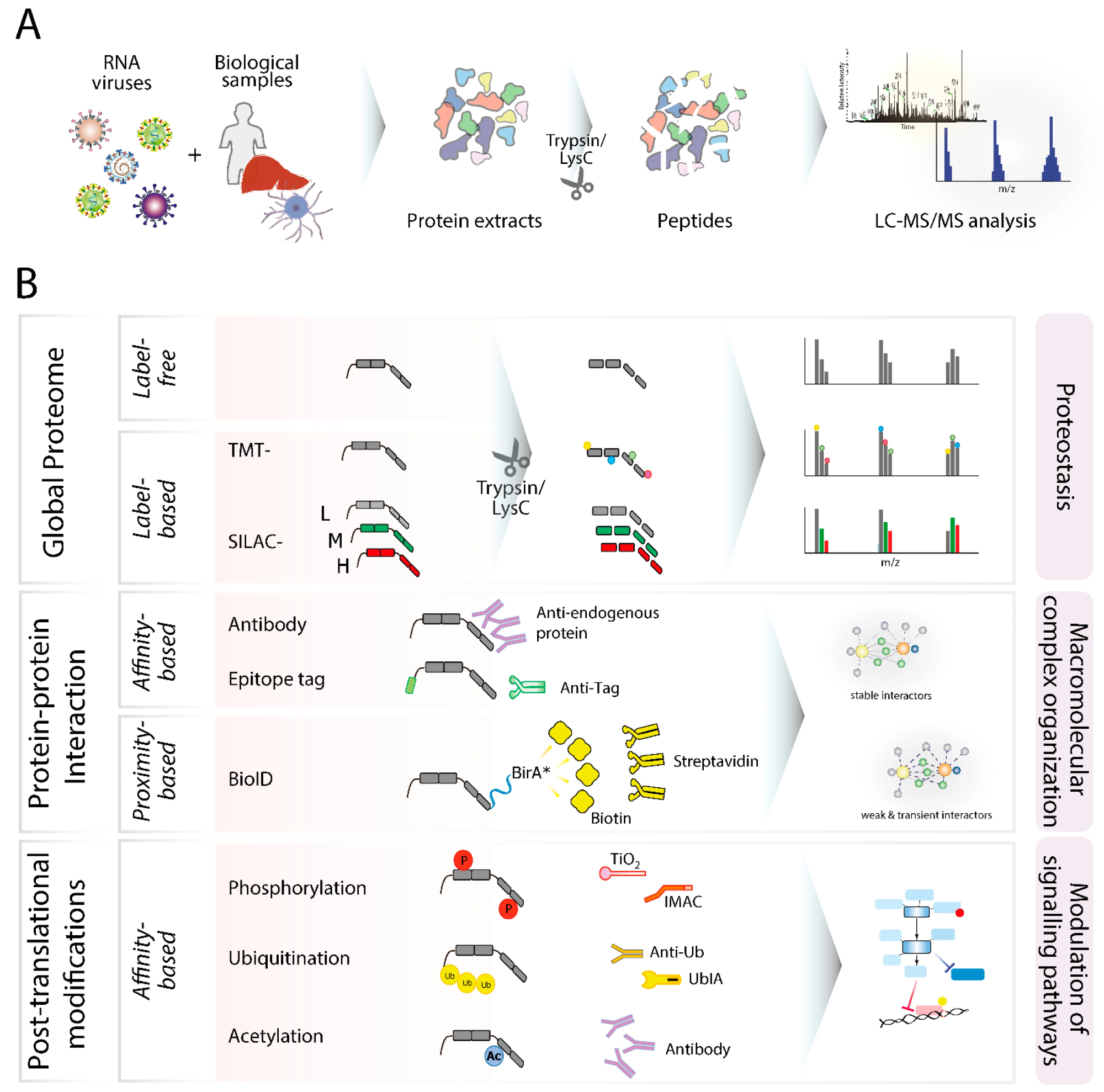 Overview of mass spectrometry–based proteomics workflows for studying RNA virus biology. (A) General proteomics pipeline illustrating sample collection, protein extraction, enzymatic digestion (e.g., trypsin/LysC), and LC-MS/MS analysis. (B) Comparative strategies for proteome analysis, including label-free and label-based quantification, protein–protein interaction mapping (affinity- and proximity-based methods), and post-translational modification profiling, highlighting their roles in proteostasis, macromolecular complex organization, and signaling pathway modulation.5