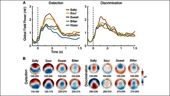Kathrin Ohla and Raphael Wallroth explored how this process unfolds in human adults as they detected one of four solutions — salty, sour, bitter, and sweet — and discriminated between salty versus sour and sweet versus bitter. The researchers found strong correspondence between participants’ reaction times and their brains’ electrical activity during these tasks, suggesting that these computations take early in the taste-processing pathway. Salty and sour were more quickly detected than they were identified whereas virtually no lag between detection and discrimination was observed for sweet and bitter. As participants rated sweet and bitter tastes as more and less pleasant, respectively, and salty and sour tastes as neutral, this additional information may have facilitated the differences in processing speed.