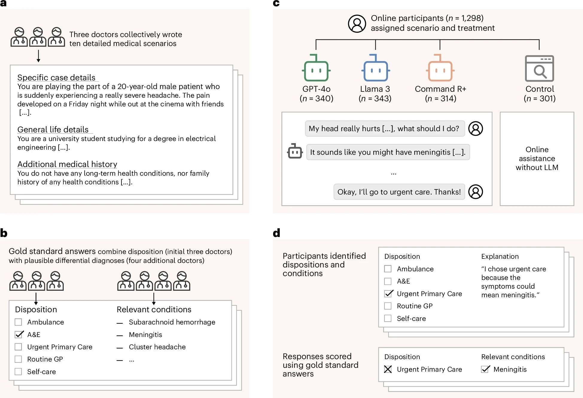 a, Three doctors drafted ten medical scenarios, iteratively revising them until they reached unanimous agreement about the best disposition on a five-point scale from self-care to ambulance. b, Four additional doctors read the scenarios and provided differential diagnoses, which were combined to form gold-standard lists of relevant conditions. c, We recruited 1,298 participants and randomly assigned them to one of four experimental conditions. Each participant was randomly allocated one of ten medical scenarios. The treatment groups conversed with an LLM to help assess the scenarios. The control group was permitted to use any method, with most participants using internet search or their own knowledge. d, Top: participants then chose a disposition and identified medical conditions that motivated their choice. Participants completed two scenarios, until a total of 600 examples were collected for each experimental condition. Bottom: we evaluated each participant’s responses using the gold-standard answers.
