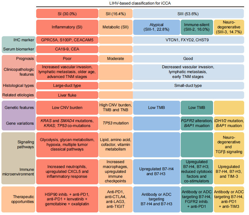 SIII group (SIII-1, SIII-2, SIII-3): Comprising atypical, immune-silent, and neurodegenerative subtypes, respectively, this group is primarily associated with small bile duct–type iCCA and generally shows better clinical outcomes. Distinct mutation patterns are observed, including enrichment of BAP1 mutations in SIII-2 and IDH1/2 mutations in SIII-3.