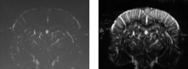 Indicative comparison of the imaging performance that can be achieved using cUS (left) and true fUS (right) for the rat brain (here involving a craniotomy), in both cases carried out by adjusting the scan settings on Iconeus One. fUS clearly has an advantage over cUS in terms of resolution and sensitivity. Image Credit: Iconeus