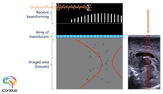 Video showing the process of transmitting a focused ultrasound beam and recording the echoes from scatterers (black dots) using conventional ultrasound. The red lines indicate the region over which the ultrasound pulses are focused, with the narrow part indicating the region of greatest focus. A delay is applied to each received ultrasound signal to account for the time taken to reach that transducer, and the signals are then summed and processed to generate the first line. Image Credit: Iconeus