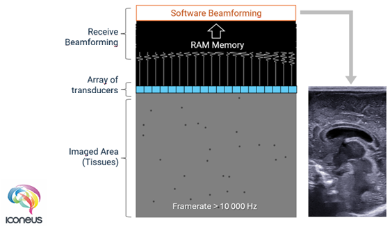 Principle of using plane-wave transmission to speed up imaging – a process that is at the core of ultrafast ultrasound, and hence of functional ultrasound. Image Credit: Iconeus