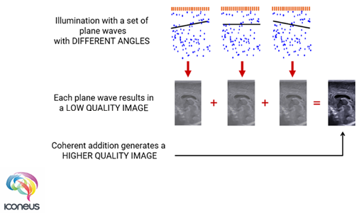 Using coherent plane-wave compounding to increase the signal-to-noise ratio in functional ultrasound images – a process that can be considered to be a type of ‘virtual focusing’. Image Credit: Iconeus