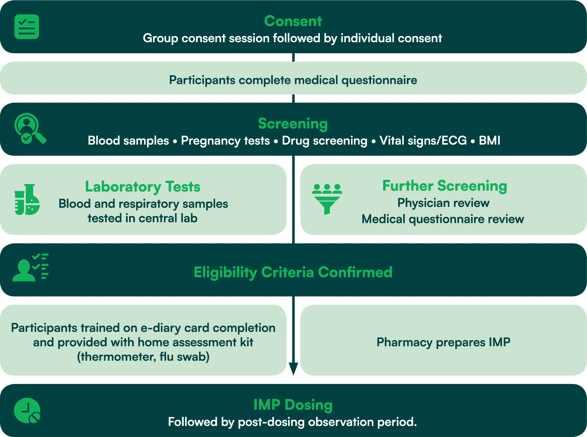 Dry runs also helped to ensure efficient use of space, manage the large workflow, and minimize overlap between screening and dosing teams. Snacks were provided to help keep participants engaged, mitigate waiting times, and prevent participant dropouts.